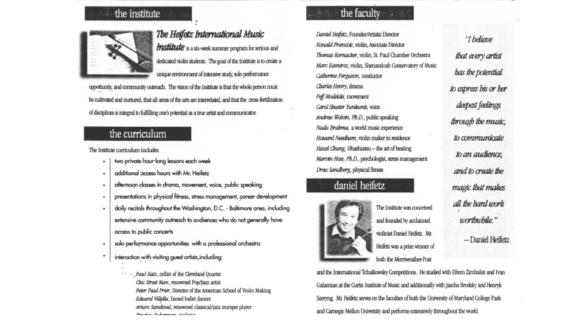 This is the first time I've ever performed at my Institute. I feel that the Institute is a place for our students and faculty, not for me, to do any performing. But we are starting a tradition that will continue next year - in the Marlboro style of bringing in great guest artists and inviting the highest caliber students to perform together in a professional performance setting. - Heifetz Institute founder Daniel Heifetz, 1997