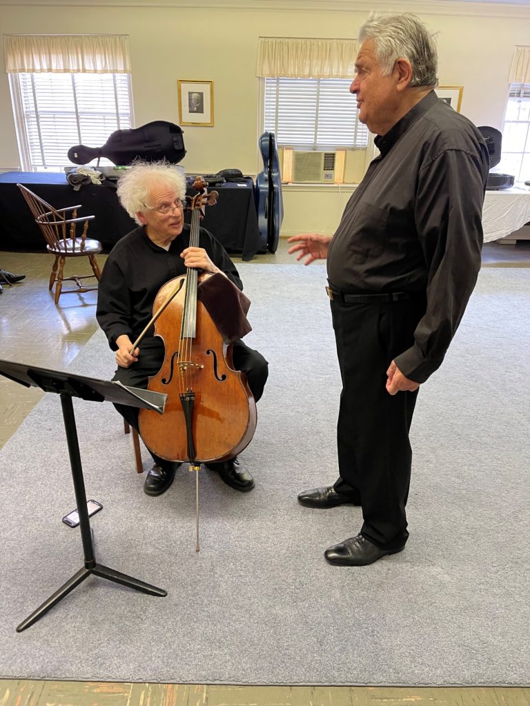 A backstage moment between two Heifetz Hall of Fame teachers – Laurence Lesser and Shmuel Ashkenasi.